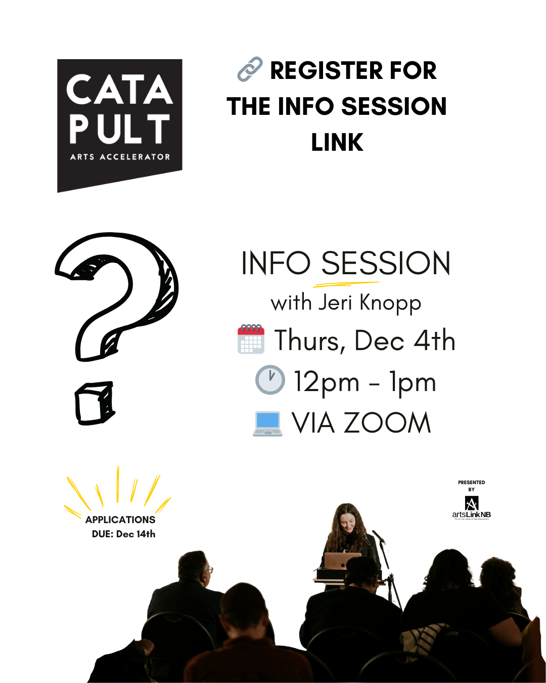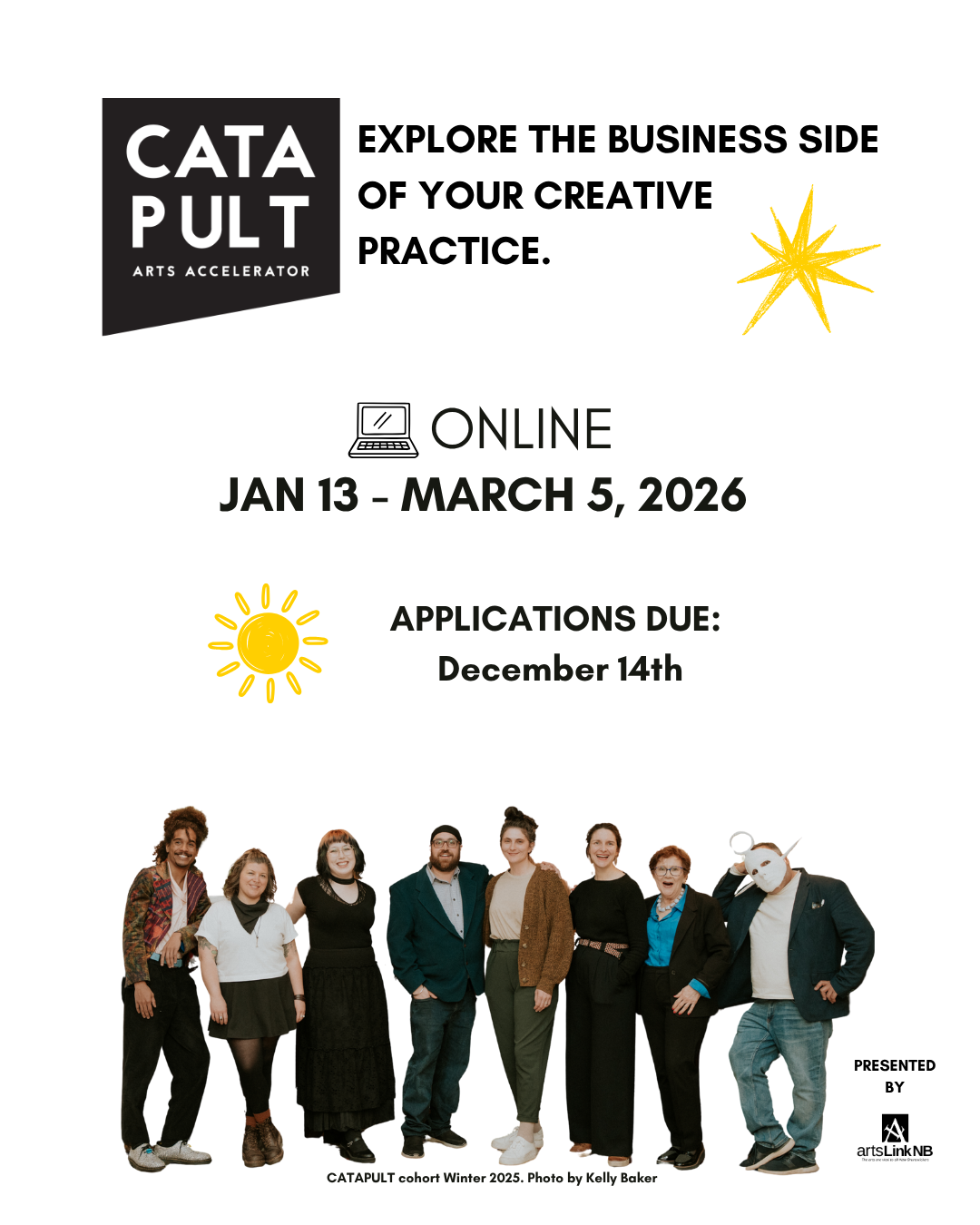 Applications are now open for CATAPULT Arts Accelerator, Winter 2026 term. Explore the business side of your creative practice from January 13 to March 5, with launch day in Fredericton, Friday, March 13, 2026.