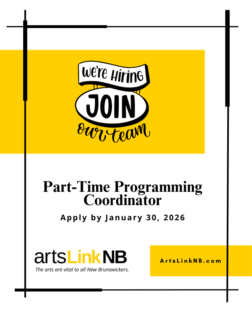 We’re looking for a Programming Coordinator to help deliver ArtsLink’s programs and support artists across New Brunswick. This role involves program coordination, administration, and communications, as well as opportunities to facilitate workshops and sessions.