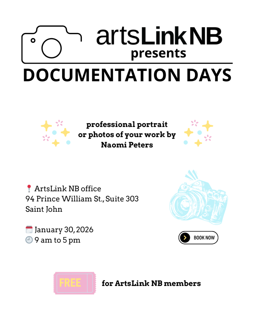 Our next Documentation Day session will take place in Saint John at ArtsLink NB’s office on January 30, 2026, 9 am – 5 pm, with photographer Naomi Peters. Book a half-hour slot and get your work photographed professionally.