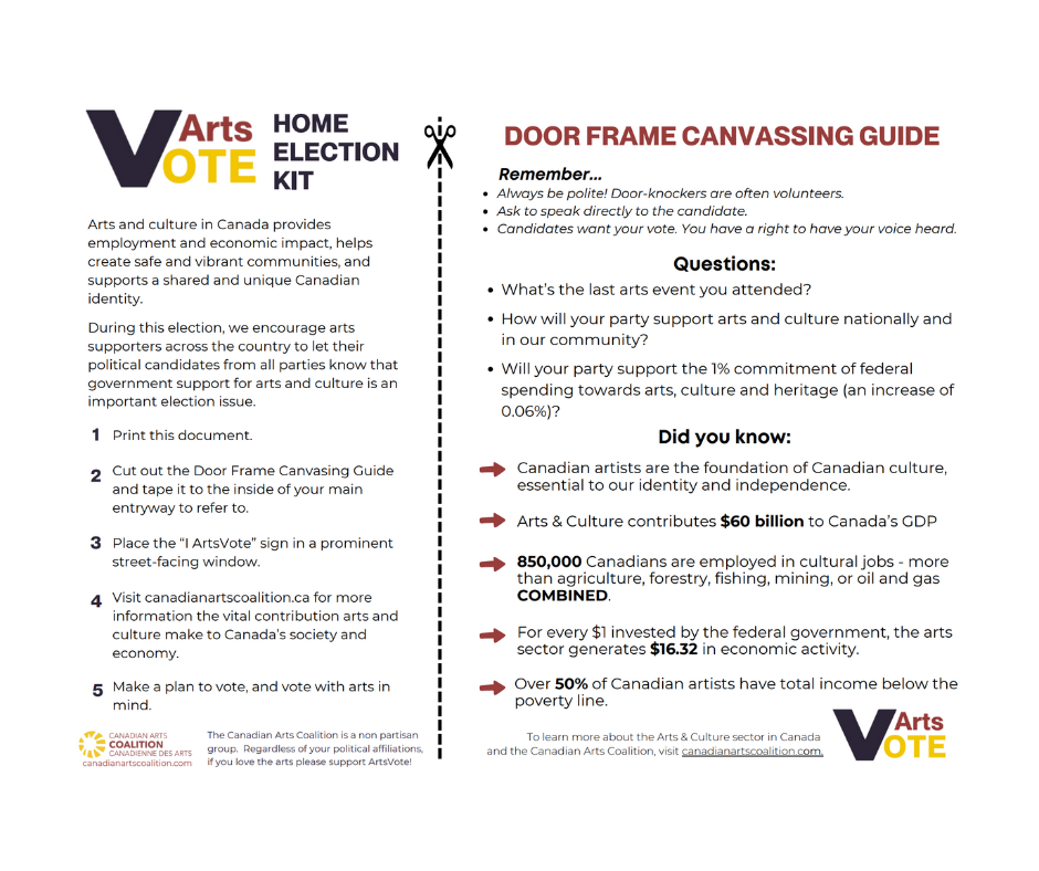 “The Canadian Arts Coalition is non-partisan (we don’t promote any party over another or tell you which way to vote) and wants all supporters of Arts and cultural expression in Canada to be informed and engaged so that all parties hear loudly that art matters.”