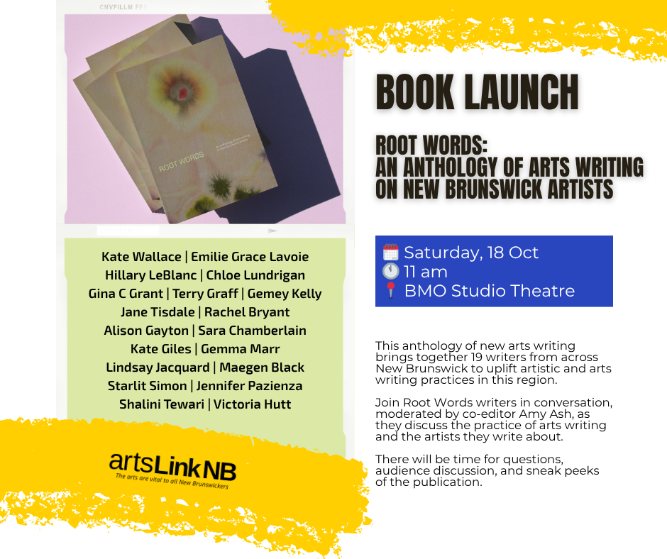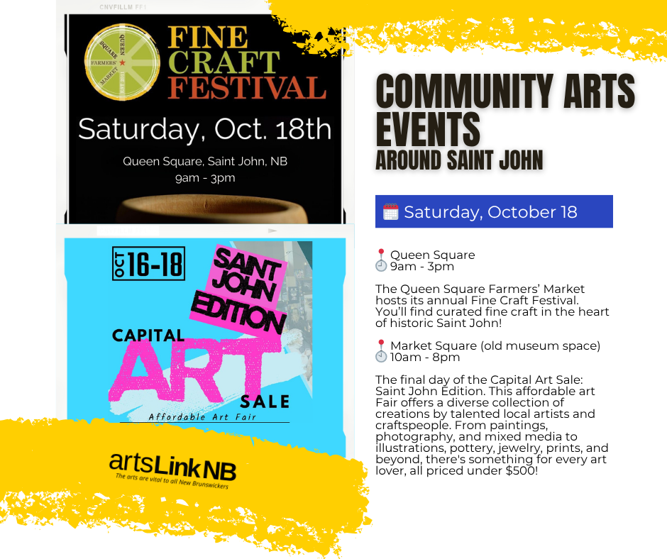 | 📚 Root Words Book Launch 🕚 11am | 🍻 Social Saturday 🕚 5 – 7pm | 🖼️ Capital Art Sale: Saint John 🕙 10am – 8pm |