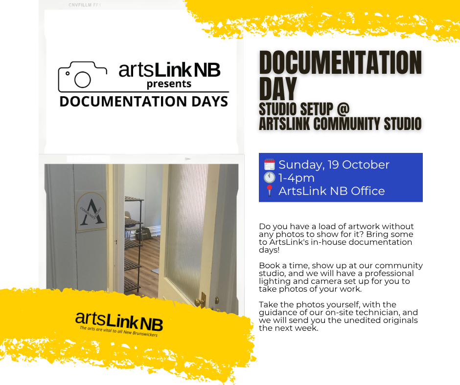 | 🤝 ArtsLink NB AGM 🕚 10am – 11:30am RSVP here. | 🧘🏽♀️ Movement for Wellness with Sarah Power and Ian Gibson 🕜 1 – 2:30pm | 📸 Documentation Day 🕙 1 – 4pm Book a time here. |